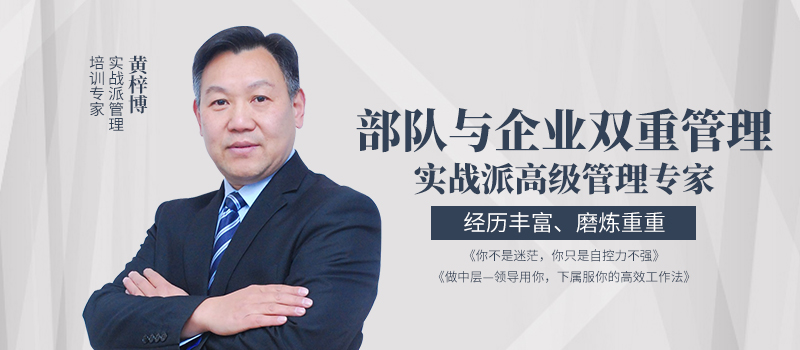 黄梓博老师是军人出生,从士兵到团长近20年的军旅生涯熠熠生辉,在部队就是一名雷厉风行的管理者,期间曾多次参加国际国内国防重点项目基地建设,转业后自己创业继续做企业管理,到现在已有20年企业管理成功经验和10年培训教学经验。部队与企业近40年的双重管理,造就了黄老师独具一格的实战经验,所以他的实战培训课程总会让大家有耳目一新的感觉。