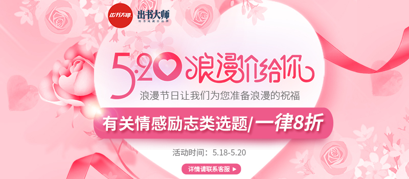 情感是人类生活的永恒主题,在出书大师网合作客户的已出版书籍中,有诸多和情感相关的书籍选题,无一例外,它们都深深地引起了广大读者的共鸣,取得了火爆热销的佳绩。为了回馈广大新老客户,出书大师网在“520”这个美妙的节日,也送上了浪漫的祝福:在节日期间,只要是有关情感励志的选题,统一八折,以浪漫价成就节日爱的仪式感。
