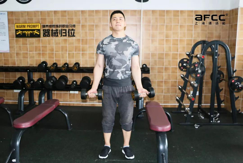 自然站立,双脚分开与肩同宽,脚尖向前,膝关节微屈不超过脚尖,头部居中挺直,目视前方,挺胸收腹,下颌微收,双手反握哑铃置于大腿前侧,双肘微屈,肩部下沉略微后缩,这是动作的起始位置