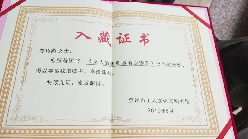 书籍是知识文化传播的有效载体,而好书更应当值得被分享。据悉,陈巧燕老师著作《女人的善良 要有点锋芒》已正式被泉州市工人文化宫图书馆收纳典藏,奉飨读者。除此之外,图书馆还特地颁发证书给陈巧燕老师,以鼓励陈巧燕老师继续创作,再度为广大读者奉送优秀的作品。