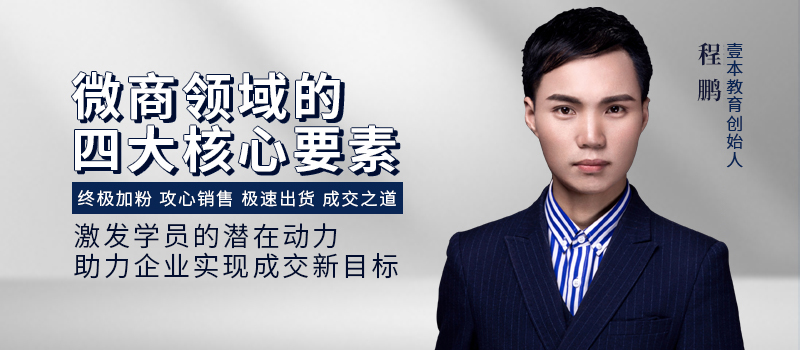 从实证主义的原则出发,程鹏老师在微商领域纵横十余年,可谓是战绩斐然,令人赞叹。他曾给微电商、直销、军工、国企做过各类培训和营销策划,服务超过100+品牌,影响微商人群500万+ ;曾经单场培训现场出货5000多万,一星期吸粉过1万;他被业内誉为:引流、招商、营销、裂变、线上线下专家,身任中国微电商教育学院特聘导师以及中国微商实战派导师,率领各大企业团队勇攀微商行业的新高峰。