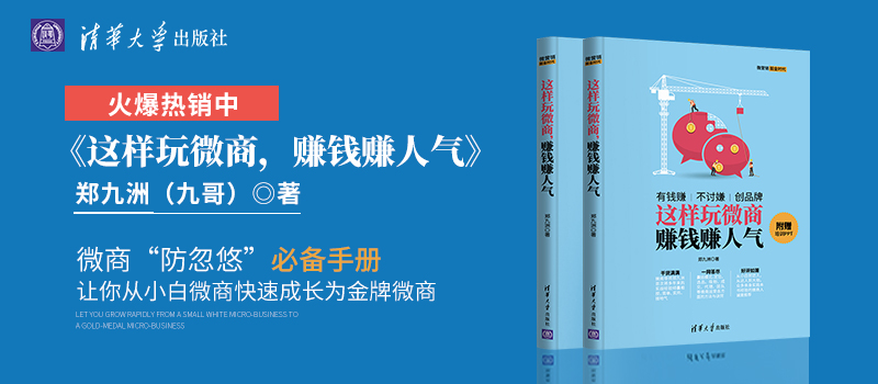 其中《这样玩微商,赚钱赚人气》一书,九哥带来了丰富的干货知识和独到的微商运营见解,大家学习后很快就能找到好货源,快速增粉,引爆人脉,最终从草根逆袭成微大咖。