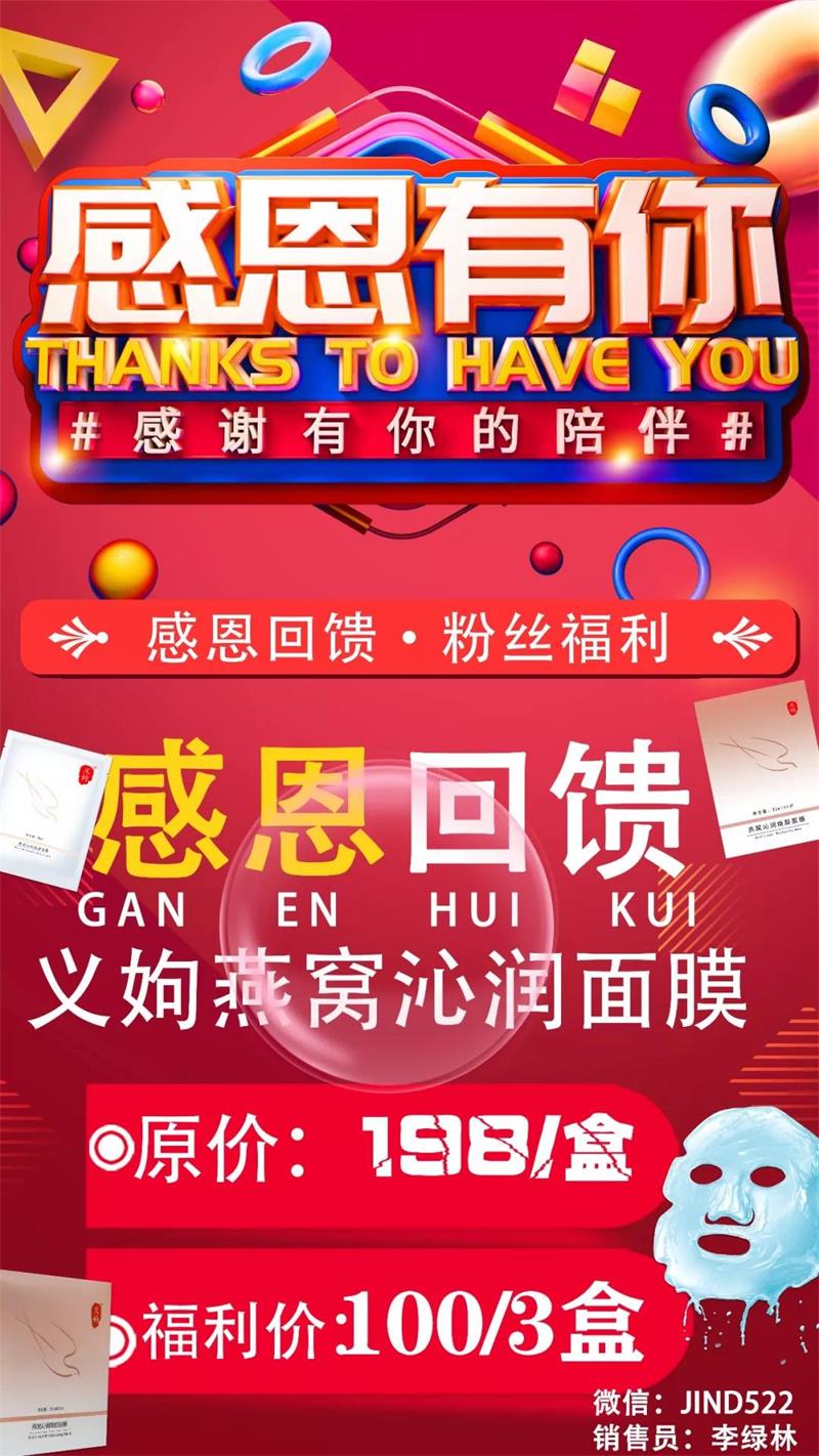 义姁燕窝焕颜补水面膜平时是198元1盒,现在为了做一下市场口碑100元就可以拿走3盒,我今天就抢购了9盒,大家赶紧去加一下微信JIND522抢够哦!!!