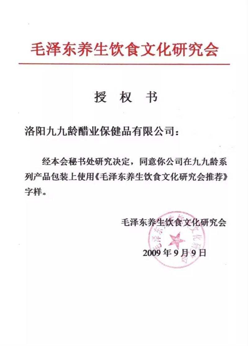 2005年5月:成为“毛泽东养生饮食文化研究会”特别授权推荐:九九龄系列保健产品。