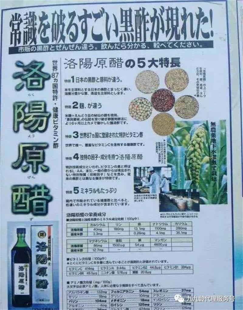 『九九龄维他醋含有乙酸、琥铂酸、柠檬酸、苹果酸、草莓、乳酸等多种有机酸。还含有蛋白质、氨基酸、脂肪、糖类、钙、磷、镁、铁、维生素B1、尼克酸及三羟基丁酮、三羟基丁酮与芳香性酯等。它具有抗菌、防止感冒、降胆固醇、预防康复糖尿病、防癌抗癌、调节血压、润肠通便、减肥美容、解酒、防止晕车等独特功效。』