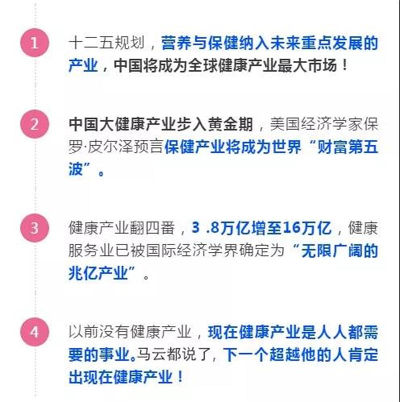 随着我国经济平稳较快地发展,人民生活水平的提高,对健康服务的需求正在从传统的疾病治疗转为疾病预防和保健养生。新华网报道:中国将成为全球健康产业的最大市场。事实证明:未来大健康产业所孕育的行业机会是显而易见的,错过新零售健康产业就是拒绝财富与健康!