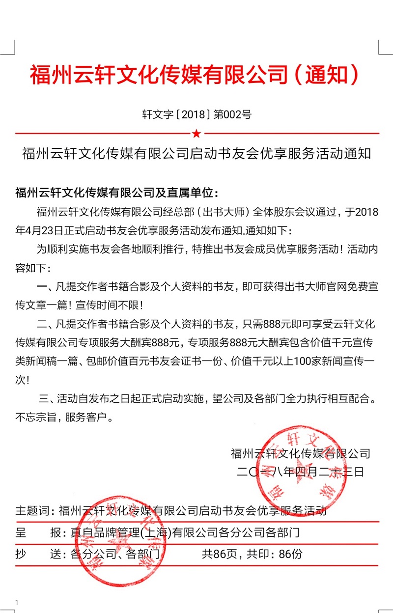 凡提交作者书籍合影及个人资料的书友,即可获赠出书大师官网免费宣传文章一篇(宣传时间不限)的尊享特权;除此之外,只需888元即可享受云轩传媒的专项服务,专项服务包含价值千元宣传类新闻稿一篇、包邮价值百元书友会证书一份、价值千元以上100家新闻宣传一次。这样物超所值的福利,非你莫属!
