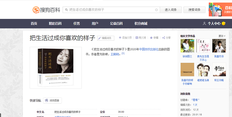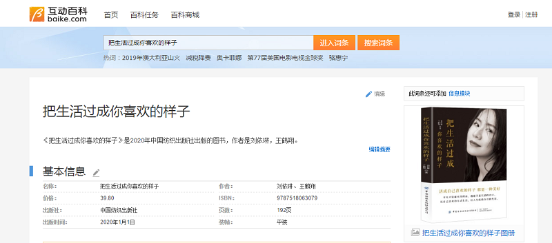 近日,由亲享品牌创始人刘依琳、杰出青年王鹤翔两位老师著作,委托出书大师网全权代理策划出版的《把生活过成你喜欢的样子》一书便凭借优异的内容通过平台的严苛审核,成功被百度百科、搜狗百科、互动百科以及豆瓣网收录其中,只要在各大搜索引擎上搜索其关键词,便能获取相关讯息,借助于这股推广潮流,使得刘依琳老师的个人自品牌影响力也更上一层楼,被更多的读者朋友知晓。