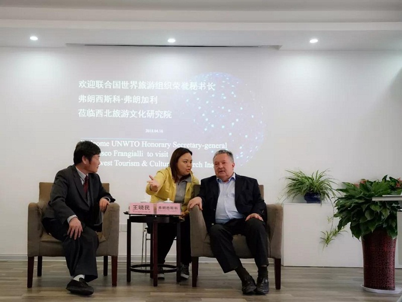 4月16日下午,弗朗加利还走进西北旅游协作区秘书处和西北旅游文化研究院,就西北地区旅游发展和与国际接轨等进行了座谈交流,听取了协作区秘书处对西北地区旅游业发展情况的介绍,希望充分利用“一带一路”倡议的国际关注度,加大对丝绸之路历史文化和自然山水资源的宣传推广,设计包装西北地区丝绸之路主线路之外的延伸线路,并扩大国际游客对丝绸之路线路产品的认知度,同时注意根据游客年龄段推广不同的线路与项目,努力提升西北地区旅游业的总体服务水平。他还欣然接受了西北旅游文化研究院荣誉院长的聘请,表示下一步将持续关注西北旅游发展,并与他的中国小组一起,帮助推广西北旅游和丝绸之路旅游线路。