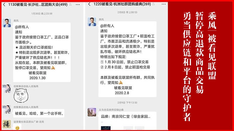 为了可以维护正常的市场秩序,同时保障供应链、平台以及消费者的多方权益,被看见联盟在创始人乘风老师的带领下,向联盟以及联盟涉及的杭州、长沙、义乌等各大团体,发出禁止口罩等高退款商品的交易。并且,为了防止高退款商品交易中会出现的退款率100%以上、缺货不退款等状况。同时,也为了防止这些行为严重扰乱市场、破坏供应链和平台名声;更为了防止可能出现的灭顶之灾。从1月30日起,禁止口罩交易;从2月8日起,禁止额温枪交易;从2月16日起,禁止瓶子交易。以便,可以让供应链、平台以及消费者等的利益免受损害。因为,只要不交易口罩、额温枪等高退款商品,就不会发生大面积的退款行为,从而能够保障到消费者的合法利益。