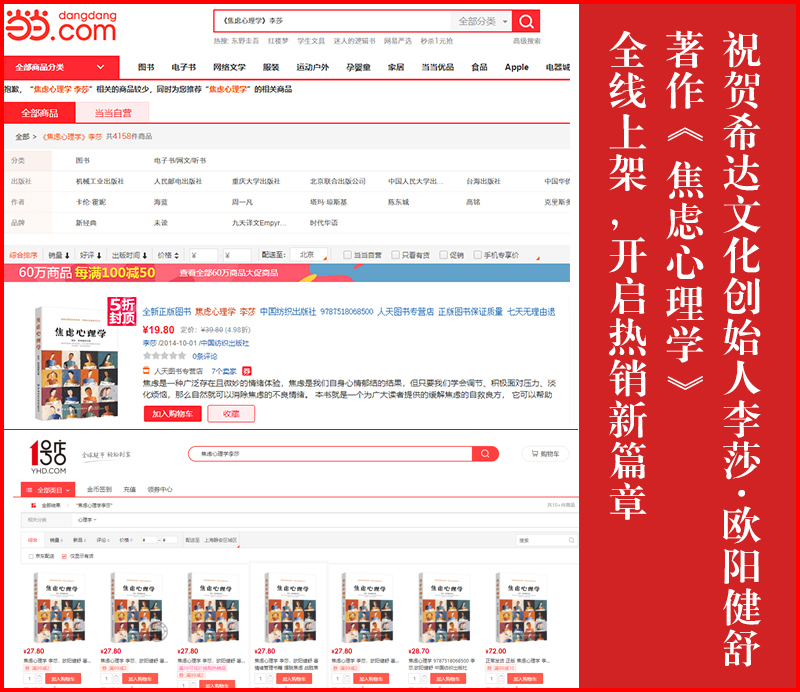 近日,由中国纺织出版社出版、希达文化创始人李莎老师与欧阳健舒老师共同创作的著作《焦虑心理学》,在京东、当当、淘宝以及一号店等平台全线上架。从而,开启了热销新篇章。