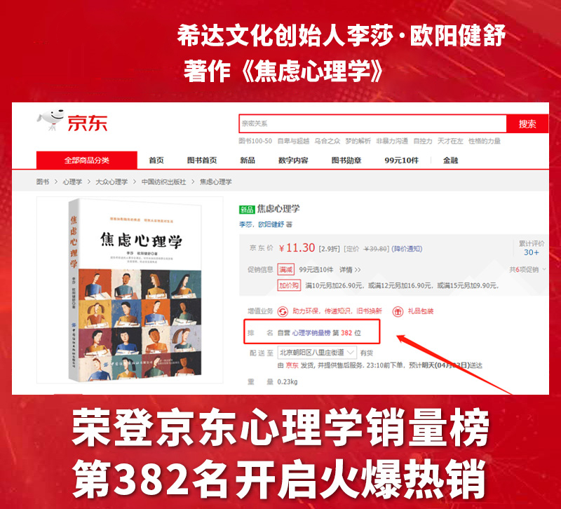 希达文化也提到,最近著作《焦虑心理学》自上架各大销售渠道以来,便受到了广大读者朋友的欢迎与青睐。该图书,也于近期喜获了京东网自营心理学销量榜第382位的好成绩。很好地说明了,《焦虑心理学》是一本值得阅读、别具价值的文字作品。而京东的销量榜名次,更进一步地说明了这本著作的受欢迎度与被认可度。