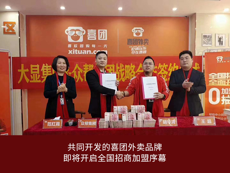 正式在这样的情形之下,大显集团联合众帮集团展开战略合作并正式签约,启动了喜团外卖全国标杆城市一百万元的落地执行方案。由此,启动了喜团外卖全国招商加盟的步伐。喜团外卖品牌,不仅零费用帮扶实体门店。而且,还在线上裂变工具、线上直播平台、线下7+1执行等方面实现零费用。同时,还为每座加盟的城市补贴百万元。