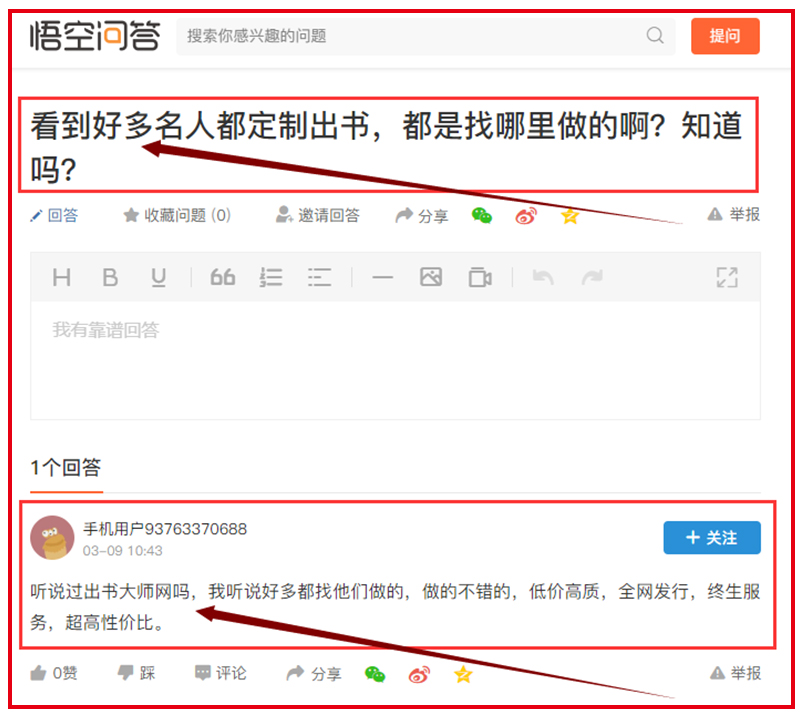 近日,出书大师网通过相关的百度、新浪、悟空以及天涯等问答平台,进行了全网层面的问答营销,在互联网上得到了很好的推广效果,同时也迎来了整体口碑的极大提升。