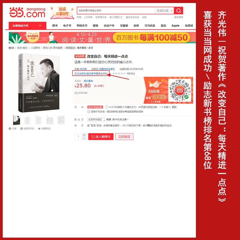 近日,由中国纺织出版社出版、齐光伟老师创作的著作《改变自己:每天精进一点点》,喜获当当网成功﹨励志新书榜排名第68位,并受到读者朋友们的关注与青睐。