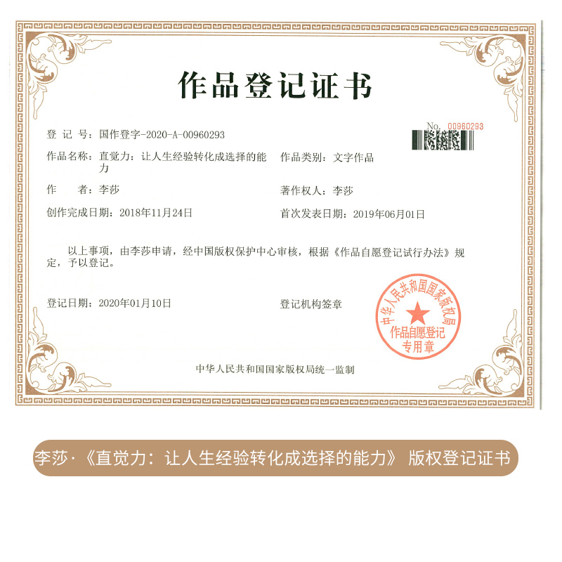在出版的众多书籍中,《直觉力:让人生经验转化成选择的能力》作为一本有份量的文字作品,由李莎老师申请,经中国版权保护中心审核,经过严格把关,于2020年1月10日登记,最终出具《作品登记证书》,登记号:国作登字-2020-A-00960293。