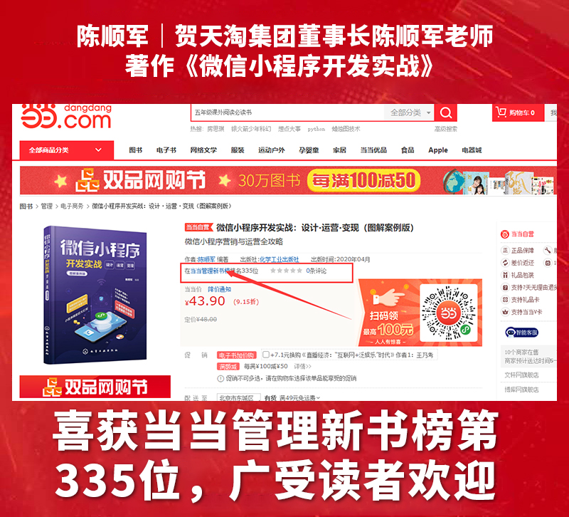 近日,由化学工业出版社出版、出书大师网全权代理策划出版、天淘集团董事长陈顺军老师创作的著作《微信小程序开发实战》,喜获当当网管理新书榜第335位,广受读者朋友们的欢迎。