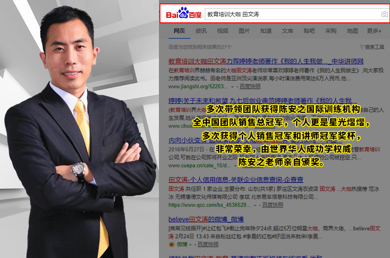 田文涛老师经验非常丰富,他多次带领团队获得陈安之国际训练机构全中国团队销售总冠军,个人更是星光熠熠,多次获得个人销售冠军和讲师冠军奖杯,非常荣幸,由世界华人成功学权威陈安之老师亲自颁奖。他的成功离不开自己的艰辛付出,正所谓“台上一分钟,台下十年功”,在不到两年的时间内,她共举办陈安之老师9次《超级成功演讲会》,平均每场演讲会人数超过1800人,破中国培训行业演讲会记录,最终成就了他今天辉煌的履历。