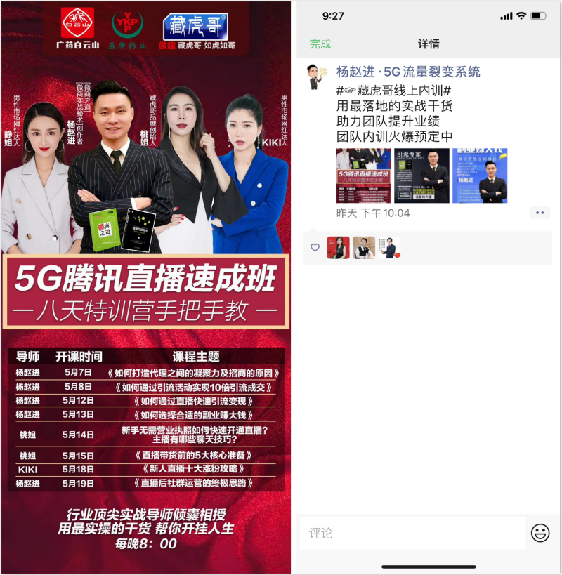 202057日,5G腾讯直播速成班八天特训营正式进行开播。引流专家、《微商之道》作者杨赵进等导师,将用最落地的实战干货,助力团队提升业绩、帮你开挂人生。目前,团队内训正在火爆预定中!
