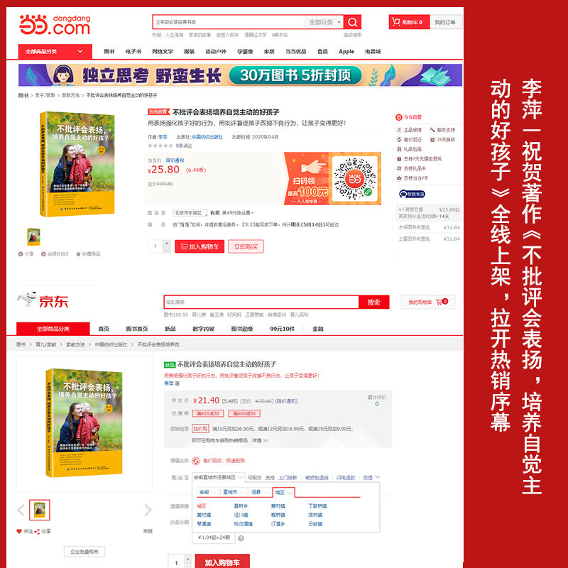 所以,这是一本非常适合已经当父母或者准备当父母的读者朋友去阅读与分享的好书。通过阅读这本亲子类家教读物,父母们不仅可以掌握如何适当地在教育孩子时进行批评或表扬。同时,还可以通过这些正确的教育模式,为孩子的未来铺垫下良好的教育基础。而近日这本著作全线上架京东以及当当等图书销售渠道,则说明了对教育孩子这方面有需求的父母,可以到各大图书销售渠道里对图书进行选购和阅读了。