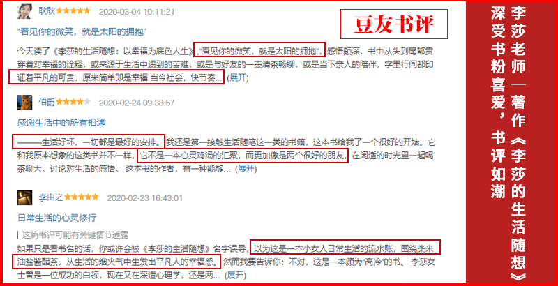 《李莎的生活随想》一书得到广大书友的喜爱,正说明在高质量读者群体中有着它广泛的读者基础,希望这本抚慰人心、直达心智的优秀书籍能够影响越来越多的朋友,感谢生命中的所有相遇。