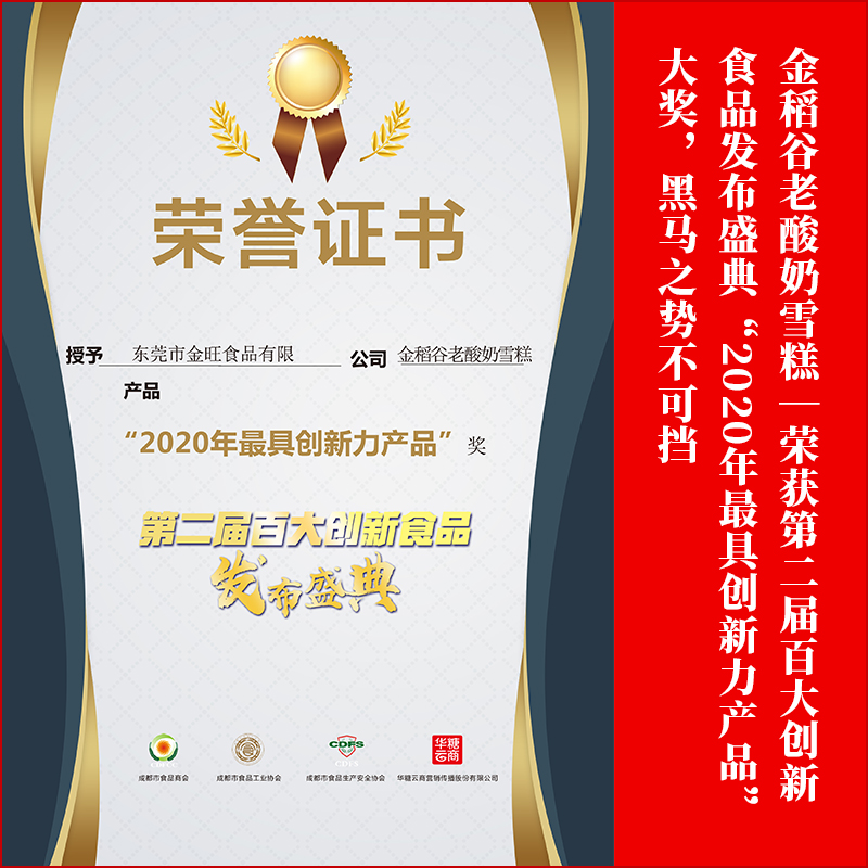 老酸奶雪糕获得本次百大创新食品发布盛典“2020年最具创新力产品”奖项,不仅大幅提高了食品的曝光量,还能够让更多的经销商和消费者了解到这些产品的特点、优势和厂商政策,从而助推食品的加速成长。这项殊荣定能为金稻谷品牌打开新的产品销路,形成新的发展空间,从而面向更加广大的客户群体,创造非凡的销售佳绩。