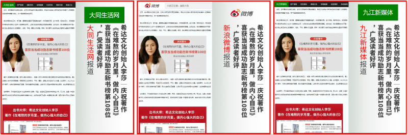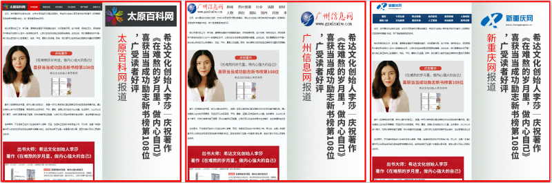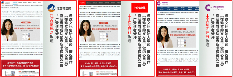 希达文化谈到:这本图书,不仅适合已经步入社会的成年人读者,而且,也适合正在成长中的学生少年。可以说,这是一本适合男女老少去阅读的励志类好书。最近,这本著作可以收获当当网成功励志类新书榜第108位,较好地说明了这是一本值得大家分享、受到大家认可的心灵读物。而且,作品还收获了来自读者朋友们的广泛好评。