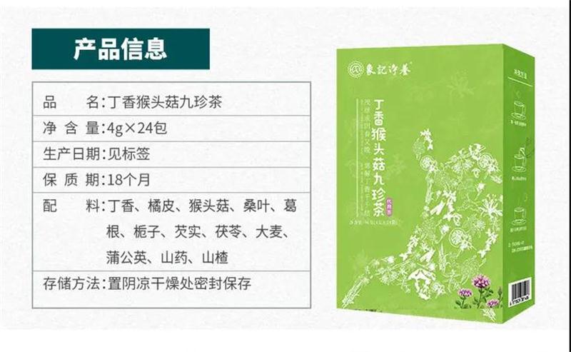 这款象记养生-丁香猴头菇九珍茶是由多种药食同源原料配比而成,  天然食材最大好处就是,不会产生药物依赖,也没有任何副作用!