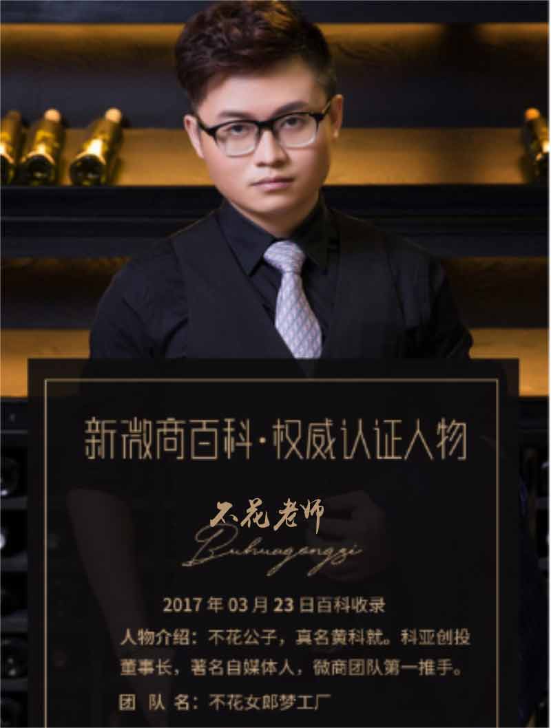 不花老师黄科就现任科亚创投董事长、4A公司联盟单位顾问,是不花女郎梦工厂的创始人,担任清华大学、北京大学、中山大学广州4A、中国美妆等新媒体/微电商领域资深顾问和特聘讲师,由他创立的“网红+社群+微电商”结合的销售模式被《销售与市场》、《天下网商》、《执行官》、《中国美妆》等众多权威杂志媒体报道,不花公子因此被誉为微商团队第一推手和中国第一微商培训导师,其粉丝累计已超过300万。