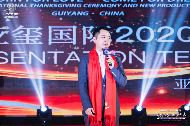 盛典开始,在现场主持人的介绍下,亚玺国际董事长邓请求先生在嘉宾热烈的掌声中上台致辞,共同回顾亚玺2019年取得的成绩,明确亚玺2020年发展新目标,感恩亚玺家人们的支持和付出,并向全体亚玺家人及家属表达了衷心的感谢及新年祝福。