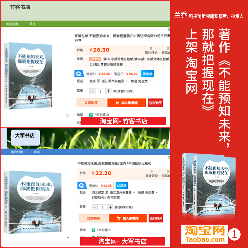 近日,由中国纺织出版社出版、出书大师网全权代理策划出版、兰乔老师创作的著作《不能预知未来,那就把握现在》正式上架京东、淘宝、当当、1号店以及新华书店等各大渠道,火爆热销中。