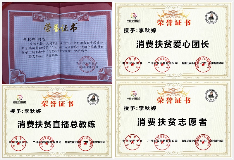 经过大家的共同努力,直播间人气高达77万,婷婷老师助力武宣三红蜜柚直播圆满成功。东乡镇人民政府为婷婷老师颁发了荣誉证书,称赞她在脱贫“千城千播,万商助农”活动中做出突出贡献,并授予“消费扶贫爱心大使”荣誉称号。同时,中国梦组委会也为婷婷老师颁发了“消费扶贫志愿者”、“消费扶贫爱心团长”、“消费扶贫直播总教练”荣誉证书。