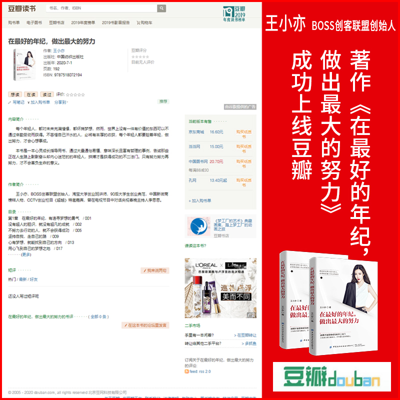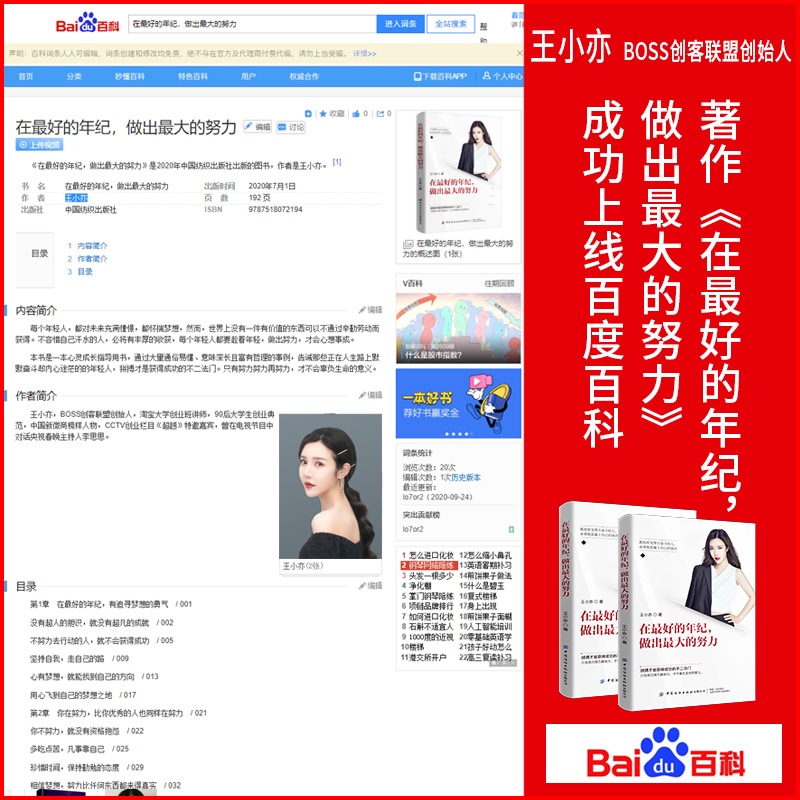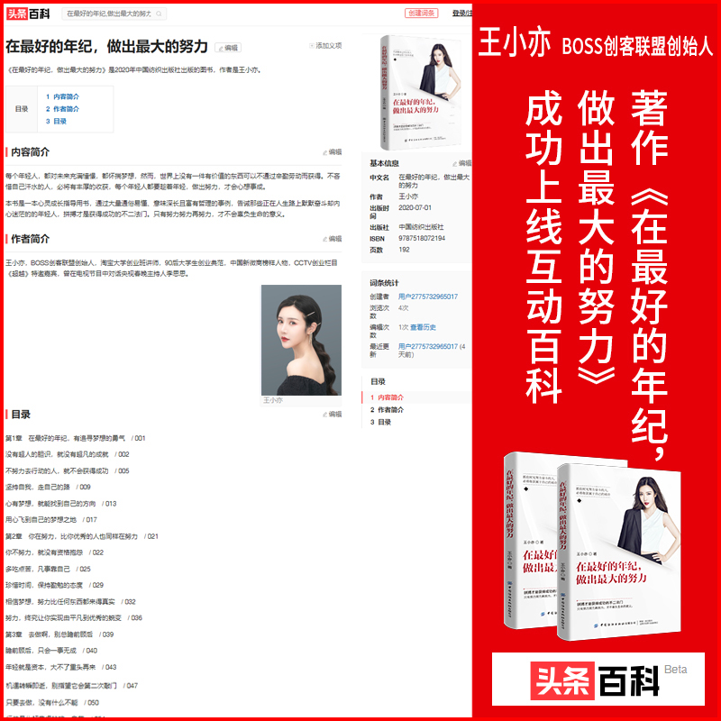 近日,由中国纺织出版社出版、出书大师网全权代理出版策划、王小亦老师创作的著作《在最好的年纪,做出最大的努力》正式上线百度、搜狗、头条百科平台,同时也上线了豆瓣读书平台,呈现出其独特的品牌价值!
