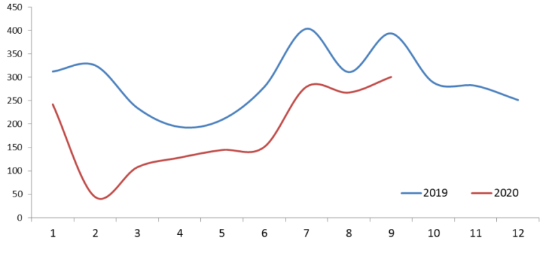 2020年前三季度实体书店渠道同比增长率为-37.43%,与半年度相比,降幅收窄明显。新冠疫情对实体书店造成巨大冲击,尤其在2月份实体书店停业造成一季度实体店渠道出现明显下降。随着疫情逐渐好转,各地实体书店逐步恢复营业,相应的开卷指数也呈现回暖趋势。但各地疫情尚不稳定,国外疫情仍然严峻,国内也存在疫情复发的可能,如6月北京就再度出现聚集性疫情,因此各大实体店铺并未完全开放,入店客流量仍受到一定影响,销售情况明显低于往年同期水平。进入第三季度之后,实体店渠道回暖明显,7月指数呈现明显上升,8月有正常回落,但幅度小于往年同期,进入9月后,指数进一步上升,达到今年指数最高点。