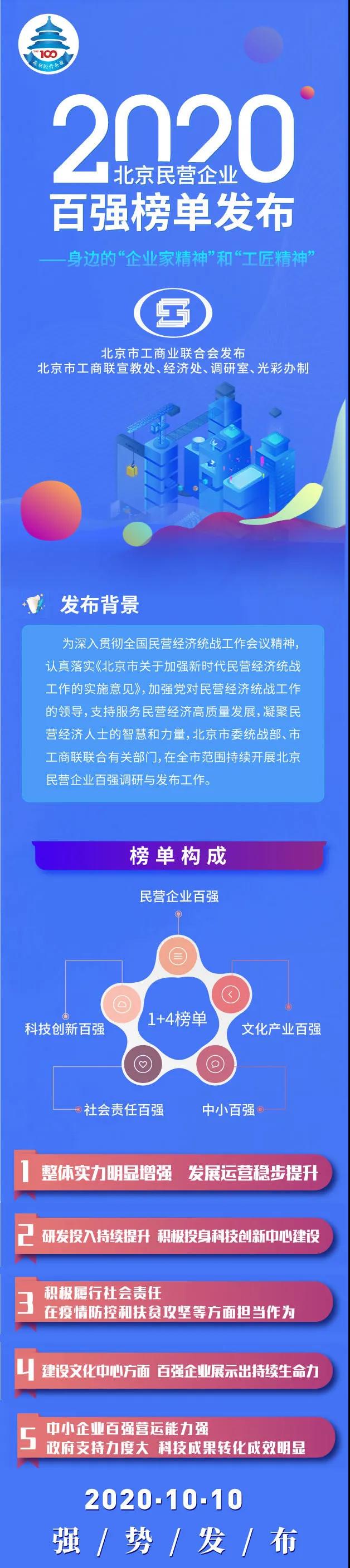 此榜单呈现了“整体实力稳步提升,研发投入持续加大,盈利能力显著增强,产业结构不断优化,社会责任担当有为,独角兽和隐形冠军企业后劲十足”的特点,表明了民营经济在首都经济社会发展中扮演着越来越重要的角色。