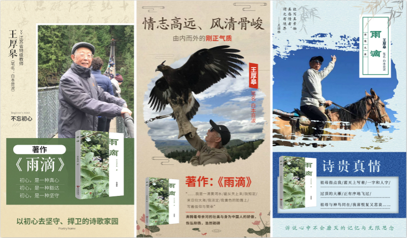 王厚皋老师,是一个热爱生命、生活以及亲人的作家。多年来,他前往各地的名山大川、江河瀑布以及大海长空,深深地体验了自己对生命、自然的感受与体悟。于是,他把在这些经历中的所想、所感以及所悟,都熔铸到了文字表达当中,并将自己对祖国河山的情怀、对生活的喜爱以及对亲人的珍惜,都化作了一篇篇的诗歌作品。王老师的笔耕不辍以及对人生的深刻体会,让这些诗篇富有了动人心弦的灵性与多元神韵的意义。从而,形成了富有人文风格与初心情怀的诗集《雨滴》。