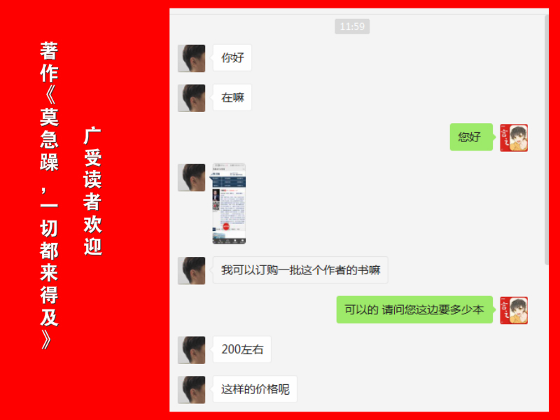 最近,著作《莫急躁,一切都来得及》广受读者朋友的欢迎。他们,纷纷咨询和订购刘鑫老师的这本图书作品,并呈现出积极、喜欢的热情。可见,这本图书著作是得到了不少读者的喜爱与青睐的。而作品广受读者朋友的欢迎,一方面说明了这本著作的内容切合广大读者朋友的精神需求,另外方面也表明了这本著作自身内容的优质与有效。同时,更表明了这本图书作品的品牌影响力得到了有效展现,更见证了刘鑫老师作为书作者的品牌魅力的呈现与提升。可以说,这是著作带来多方共赢局面的较好体现。
