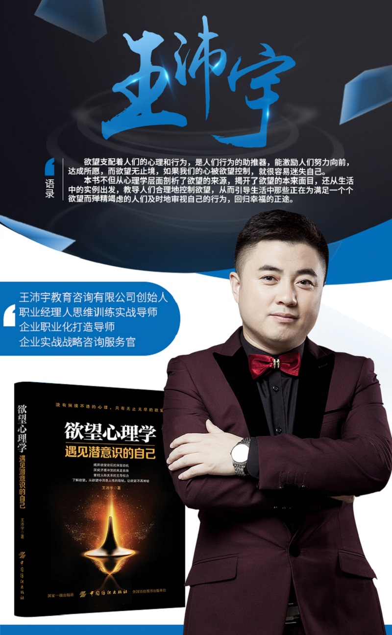 著名企业职业化打造导师、山西玖零执行掌门人王沛宇老师的全新著作《欲望心理学》,在出书大师不遗余力的全网推广策划下,自上线以来销售火爆,受到很多书迷朋友的热烈追捧,从思想层面上潜移默化的改变了很多人对于欲望的认识和基本看法。1988影像创始人王远远对此表示深以为然,这本书给了他很大的启发,进一步了解内心最深处的欲望需求,遇见潜意识的自己。