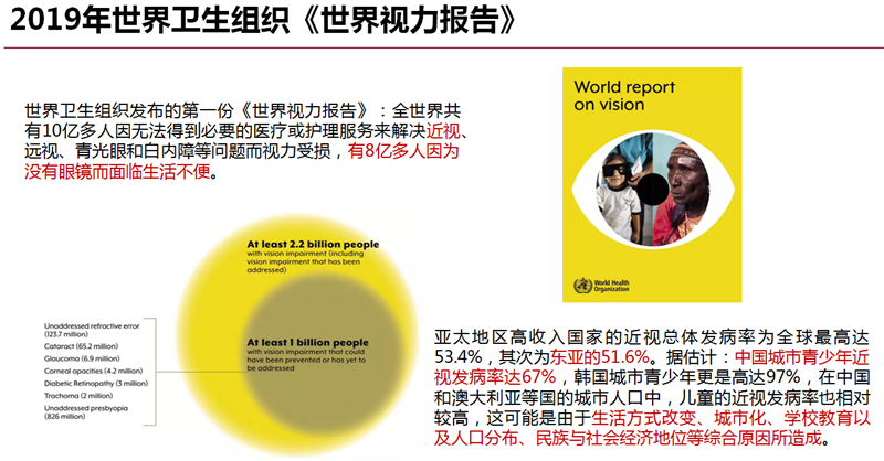 据2016年发布的我国首份系统研究视觉健康的白皮书《国民视觉健康》显示,我国5岁以上人群中,每3个人就有1个人是近视。如果不能采取有效的政策干预,预计5年左右,我国5岁以上人口的近视发病率将增长到50.86%至51.36%。白皮书同时指出,高度近视容易产生各类眼底病变,造成严重的永久性的视功能损害。近视的可遗传性和家族聚集性会影响我国未来的人口素质。目前,近视的问题在我国非常严重,严重到什么程度呢? 北京大学教授李玲于2015年发布的《国民健康视觉报告》中提到:近视不仅对生活带来不便,甚至影响到了收入水平。处于劳动年龄阶段的中度视力缺陷患者,年劳动收入比视觉健康的人群要低3796元,这一收入差距相当于城镇居民家庭人均可支配收入的1/10、农村居民家庭人均收入的1/3。这一人群的劳动收入损失总计约3909亿元。2012年各类视力缺陷导致的社会经济成本高达5600亿元左右,占GDP的比例高达1.1%左右。同时,青少年近视率高导致未来在航空航天、精密制造、军事等行业领域,符合视力要求的劳动力可能面临巨大缺口,将直接威胁我国经济社会可持续发展以及国家安全,近年来征兵、消防员、民航飞行员等的视力标准要求都在逐年降低。