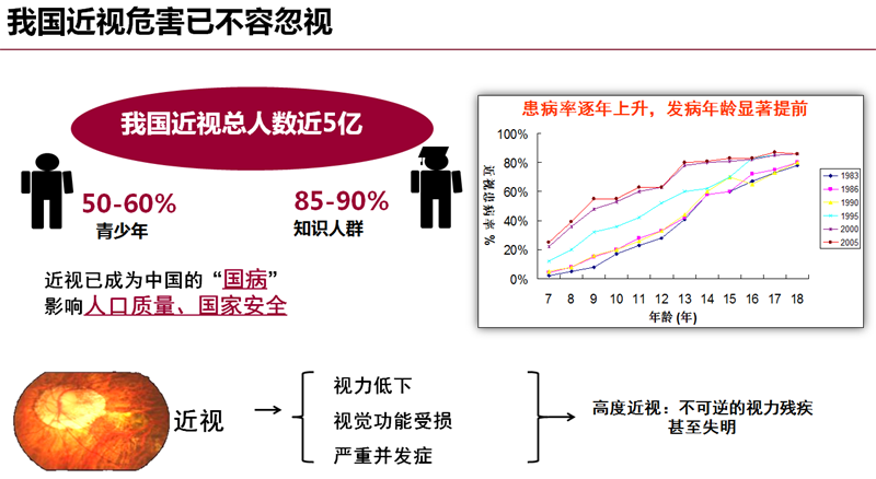 陈楠华:近视问题并不简单,不是一个戴眼镜就能看清的问题。我们要知道,近视是不能治愈的,它的度数还会不断增长,尤其在儿童青少年时期,随着用眼时间越来越长,每年的近视度数都会不断增长。当度数达到一定程度时,人的眼轴就会发生变化,从而引起一系列的眼底变化,导致患白内障、青光眼的机率更大,还可能引起各种斜视病症。