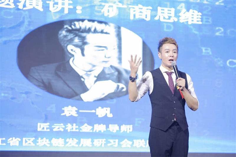 李老师从区块链的底层技术讲到了区块链国家政策走势,他的言语风趣幽默,现场不时响起阵阵掌声。 李派克之后,浙江区块链发展研习会联席主席,匠云社金牌讲师袁一帆先生上台进行了《矿商思维》的主题演讲。