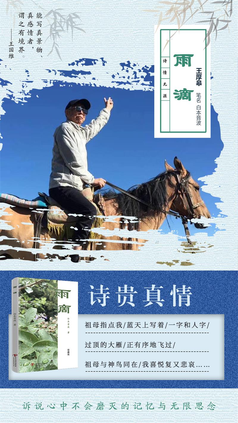 《雨滴》收集的,主要是王厚皋近几年诗的汇集。去年11月《雨滴》出版后,上线百度、头条、搜狗等各大百科平台以及豆瓣读书,这些媒体纷纷对《雨滴》进行了热情地推荐。这是王厚皋多年写作以及著作本身被机构和广大读者认可的一种证明,不仅体现了这本图书自身的权威性、被认可度、受欢迎度以及美誉度,而且更体现了王老师以及作品自身的实力。
