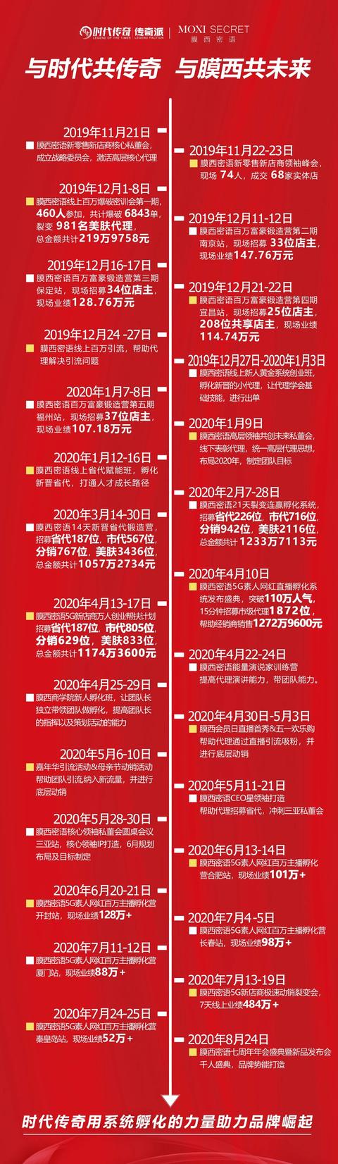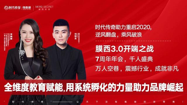 膜西密语于8月23日举办的七周年千人盛典,盛况空前,2020上半年“战疫”已取得阶段性胜利,下半年“重启”已启动,时代传奇将全力以赴助力品牌重启财富之路,实现品牌业绩十倍暴增。