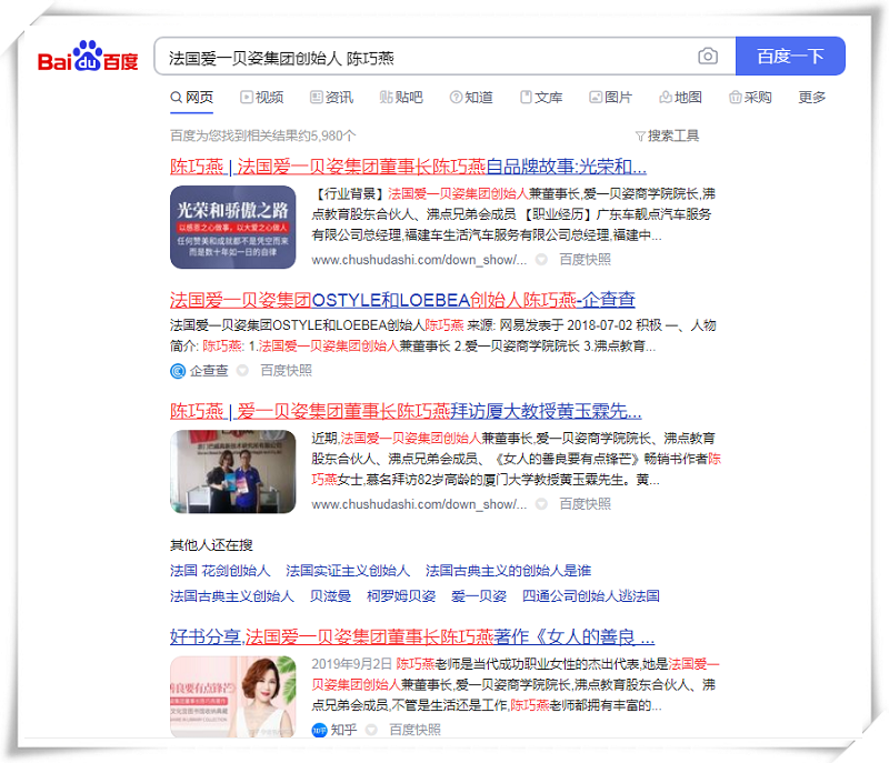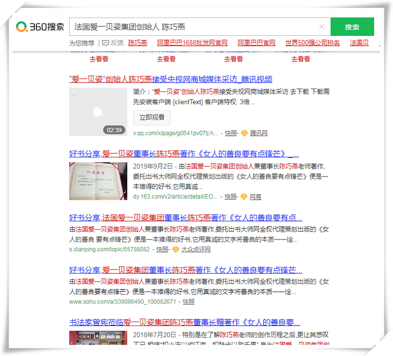 近日,通过媒体效应的不断传播与积累,以陈巧燕女士为核心的关键词不断覆盖整个360、搜狗、百度等官方平台。只需要在平台网页输入“陈巧燕”相关关键词,便能获取到相关个人信息、品牌信息以及新闻报道。通过互联网领先于传统媒体的优势,陈巧燕女士的品牌获得巨大推广,全面提升了全网个人品牌影响力。