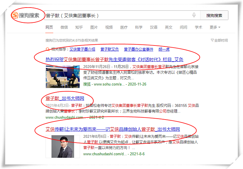 近日,艾侠集团董事长曾子默书作者关键词收录360、搜狗、百度平台。大众只需在360、搜狗、百度三大平台页面搜索“艾侠集团董事长 曾子默”等相关关键词,即可获取大量曾子默老师个人及其品牌的相关内容。通过这样高效快速的方式,曾子默老师的个人品牌得到全面推广,这不仅能够提升曾子默老师个人魅力和品牌实力,同时有效增强其品牌影响力和知名度,提升大众对品牌的好感,将大众转变为品牌顾客,最终成功实现个人IP变现。