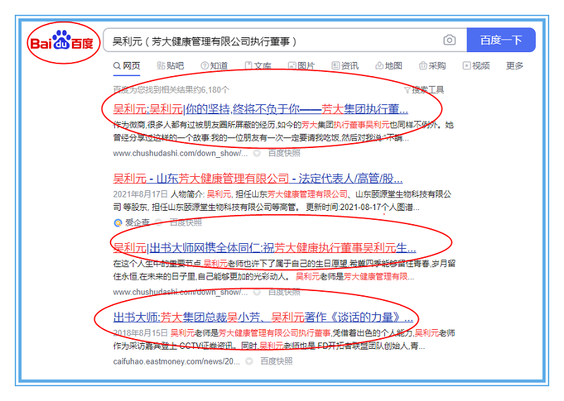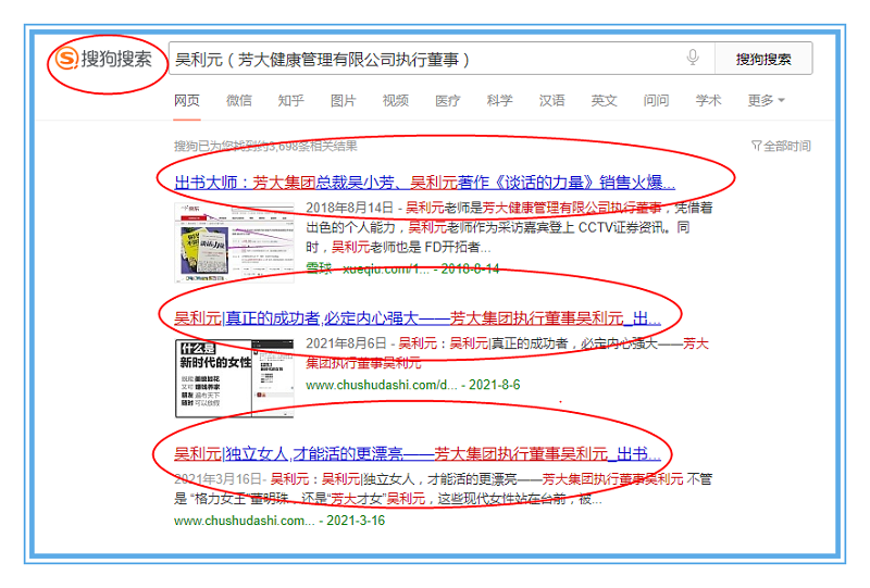 近日,芳大健康管理有限公司执行董事吴利元书作者关键词霸屏360、搜狗、百度平台,带来了品牌流量,形成了以吴利元女士为核心的品牌IP,只需在平台界面搜索“吴利元”相关关键词,便会迅速跳转页面连接品牌信息,快速的完成吴利元女士的品牌信息流入,全面提升了品牌影响力。
