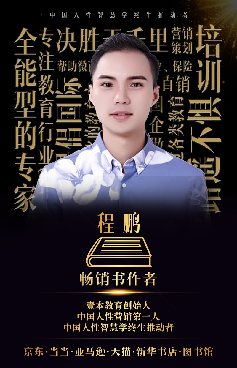 程鹏老师是大名鼎鼎的引流、招商、营销、裂变、线上线下全能型专家,凭借着出色的经验能力,被业界称为“中国人性营销优秀者”。同时他也是壹本教育创始人、中国人性营销第一人、中国人性智慧学终生推动者、十三届金鹰艺术节“明星导师”,拥有丰厚的职业生涯履历。程鹏老师自信潇洒的行业风范,来源于他十余年如一日的苦心钻研,以及不为艰辛所阻的实战精神。
