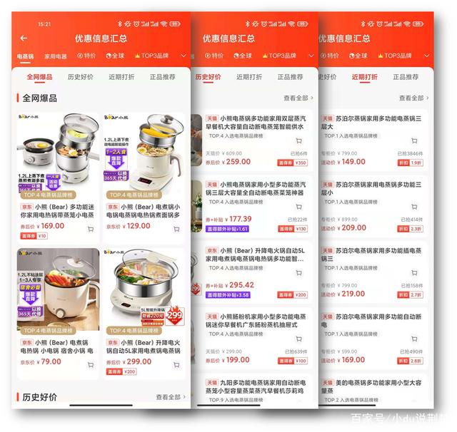 这时,你看到一个大大的“买”这个按钮。点一下,你猜能看到什么?电蒸锅的优惠销售。排名第四的小熊,是全网爆品。排名第一的苏泊尔,近期正好打折。