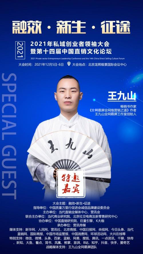 据悉,由当代直销全媒体中心、营讯会主办,当代商业研究院、北京社交电商及新零售研究中心联合主办,中国直销研究院、巨量引擎、K大咖协办,营讯传媒承办的2021私域创业者领袖大会暨第十四届中国直销文化论坛将于12月5日-6日在北京举行,活动全程由王九山全网霸屏团队进行媒体宣发支持。