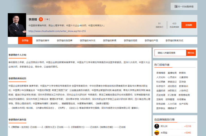 诚信书作者平台,就是这样的一个可以将个人或企业信息内容进行有效聚合、并能够集中传递给人们的一种信息源。李羿锋老师入驻诚信书作者平台,便可以将他个人的众多信息进行聚合,形成有效的品牌效应。如今,我们只要打凯出书大师网的首页,在搜索框里输入“李羿锋”这个关键词。很快,李老师的诚信书作者平台便呈现出入口。此时,点击入口便可以快捷地打开李老师的书作者平台了。